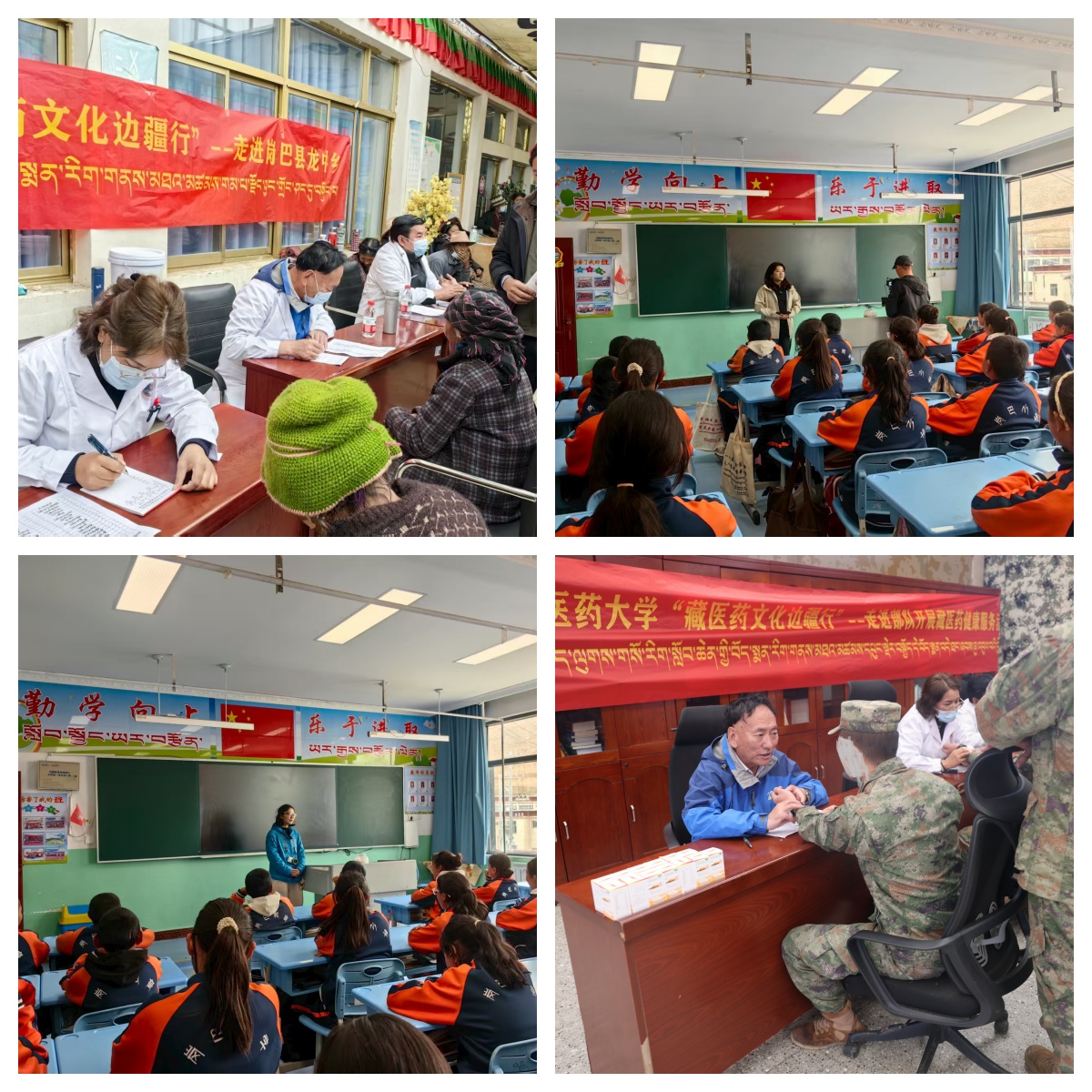 系列活动第一站:“藏医药文化边疆行”-走进岗巴县。9月15日-16日,到达岗巴县开展活动。一是关爱群众健康。我校医疗团队赴岗巴县龙中乡卫生院,开展送医送药及义诊活动。现场前来咨询与就诊的群众络绎不绝,医疗团队以专业医术守护村民健康。此次活动还为村民们免费发放了价值3万元的常用药品。二是慰问边防部队。我校医疗团队为边防官兵进行了送医送药和义诊活动,并提供专业康复建议与保健指导。藏医药文化宣讲团的学生代表以曼唐为载体,生动阐释了藏医药文化,同时讲述以抗美援朝精神为核心的红色故事,激发了官兵们的爱国热情与使命感。三是助力乡村教育。边巴次仁一行代表学校向龙中乡小学捐赠了价值2万元的各类书籍。藏医药文化宣讲团的学生代表还走进课堂,与小学生开展藏医药文化交流互动。