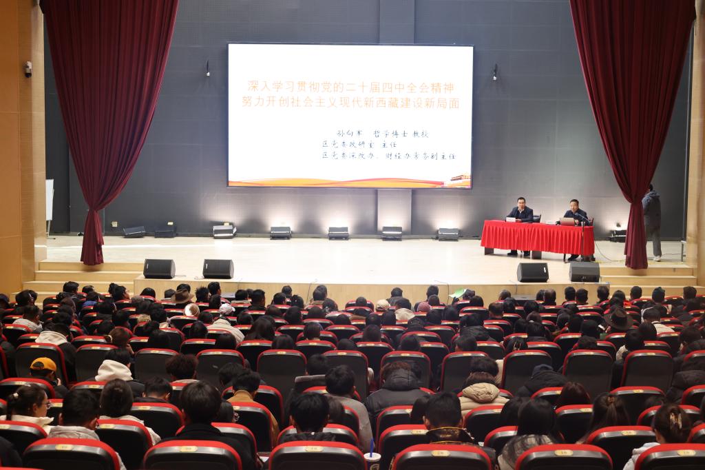 宣讲会上,孙向军教授以“深入学习贯彻党的二十届四中全会精神,努力开创社会主义现代化新西藏建设新局面”为题,强调,要准确把握 “十五五” 时期在基本实现社会主义现代化进程中的重要地位,明确该阶段的战略定位与历史意义。要深刻领会 “十五五” 时期经济社会发展的指导方针和主要目标,明晰发展的方向遵循与核心任务。要全面理解 “十五五” 时期经济社会发展的战略任务和重大举措,掌握推动高质量发展的关键路径与重点工作。要深刻领会全党全国各族人民团结起来为实现 “十五五” 规划而奋斗的部署,凝聚众志成城的奋进力量。要抓好自治区十届九次全会精神贯彻落实,明确在新征程上开创社会主义现代化新西藏建设新局面的实践要求。整场宣讲内容丰富、逻辑清晰、阐释透彻,既有理论高度,又有实践深度,对引导学校师生更全面地理解、更深刻地把握全会精神指明了方向、提供了方法。