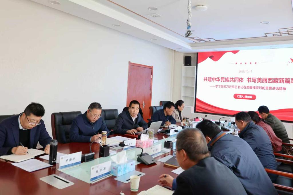 10月17日下午,学校召开党委理论学习中心组2025年第六次学习(扩大)会议,作习近平总书记在西藏视察时的重要讲话精神宣讲,传达学习中央和自治区近期重要文件精神,围绕“深入学习贯彻习近平总书记在西藏视察时的重要讲话精神,全面贯彻新时代党的治藏方略,坚持不懈推进藏医药教育事业高质量发展”主题进行学习研讨。校党委书记鞠明兵作宣讲并讲话,校党委班子成员米玛、王斌礼、边巴仓决、严蔚刚、达罗、边巴次仁、尼玛普赤参加学习会,各部门主要负责同志列席。